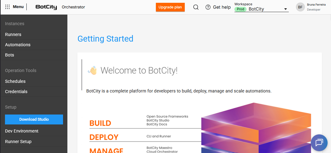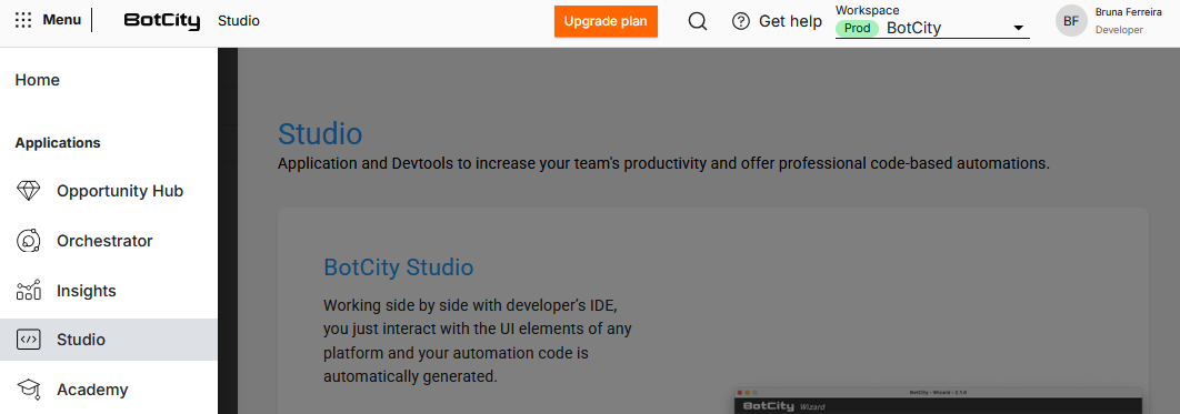 El asistente se puede descargar directamente desde BotCity Orchestrator accediendo a la página de Studio.