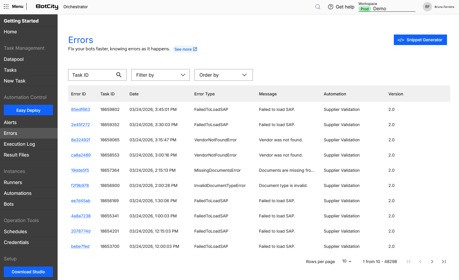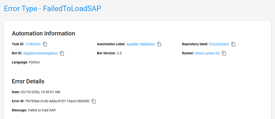 - Automation Information: Task ID, Automation, Repository, Bot ID, Version, Runner and Language.
