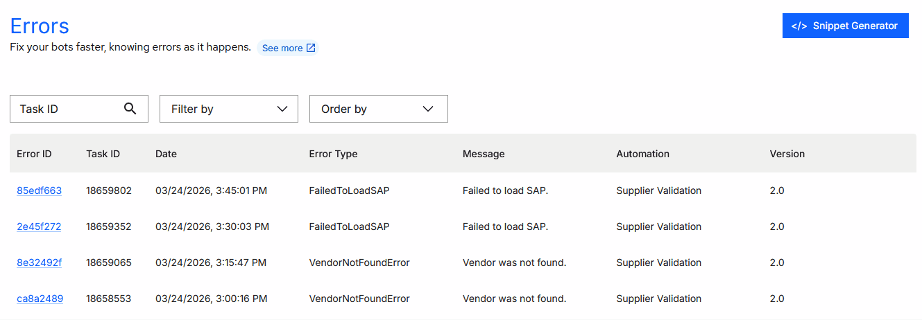 When accessing Errors in the side menu, you will find all errors triggered in the Orchestrator in table format.