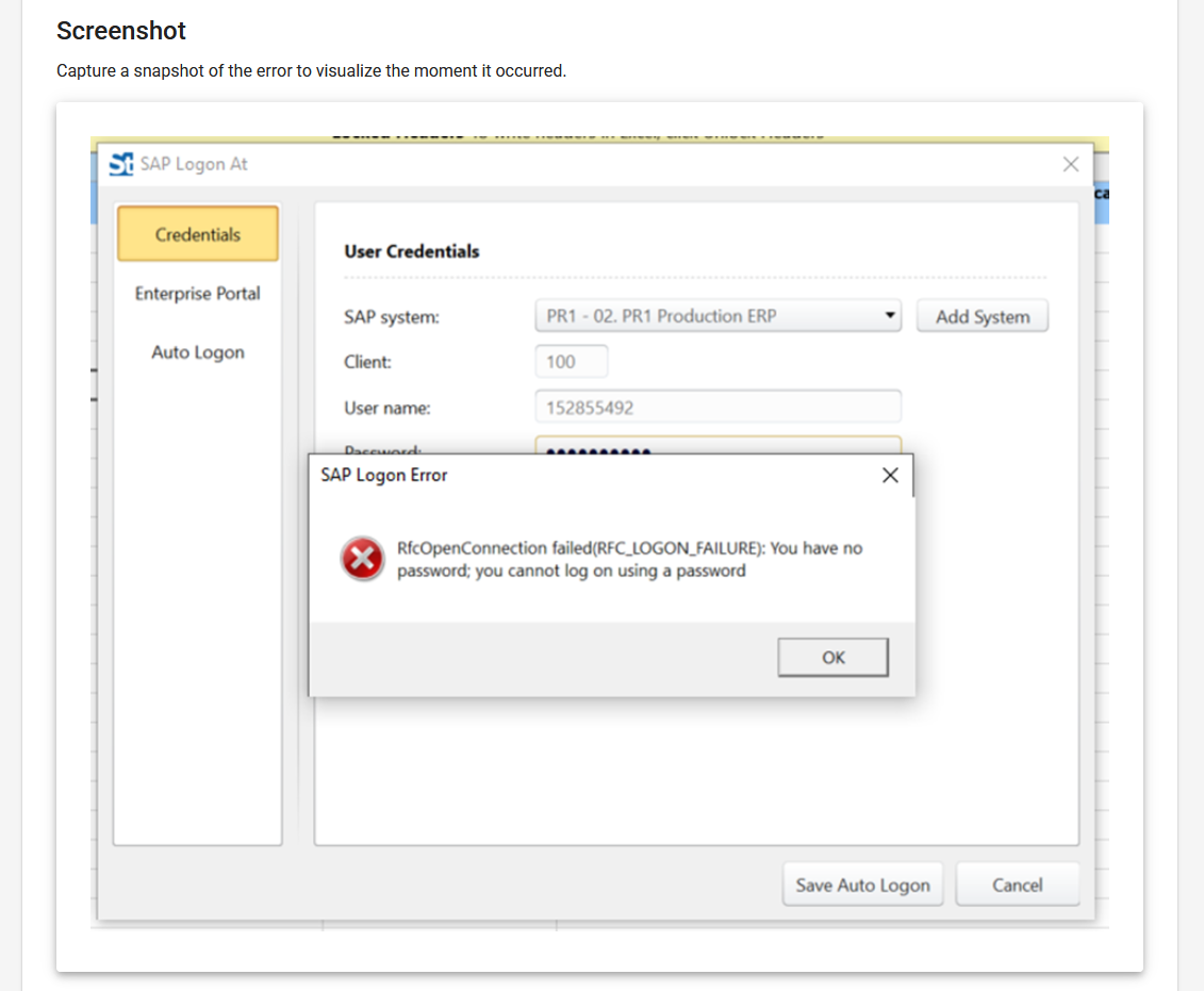 It is possible to load a screenshot at the moment the error occurs. This information is optional, but it is important for understanding what the environment looks like visually.