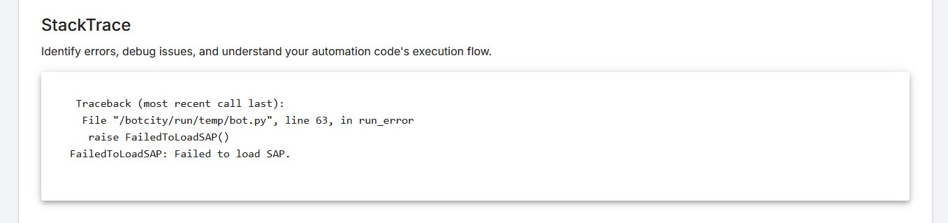 In this block, you will find the details of the error trace in the code, allowing you to analyze the exact line of code where the error occurred.