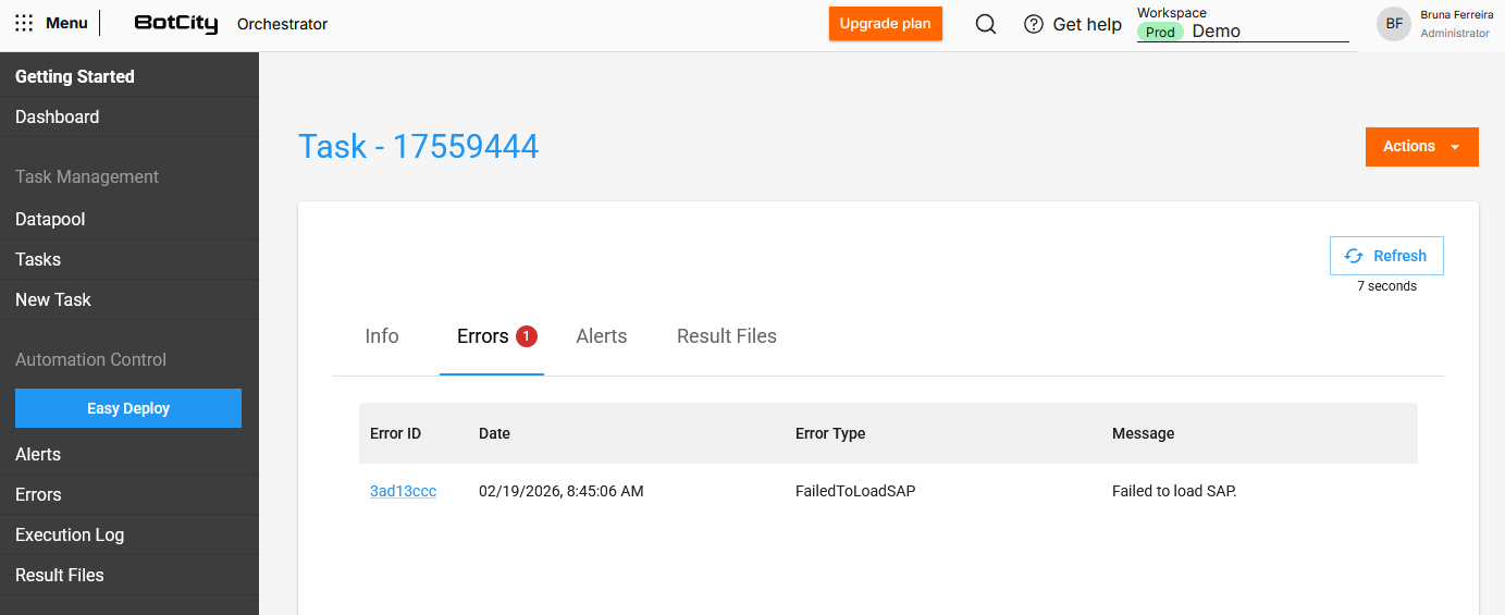 These errors are recorded in the BotCity Orchestrator, always linked to a specific task.