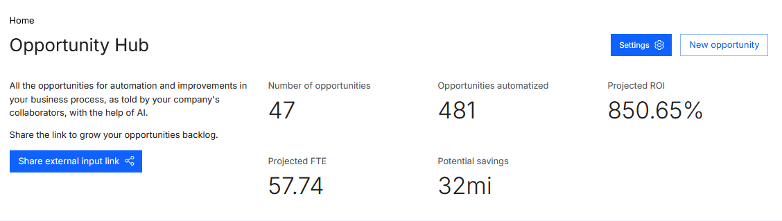 At the top of the home page, general data from the Opportunity Hub is displayed. Through this data, it is possible to get an overview of the performance of submitted opportunities.