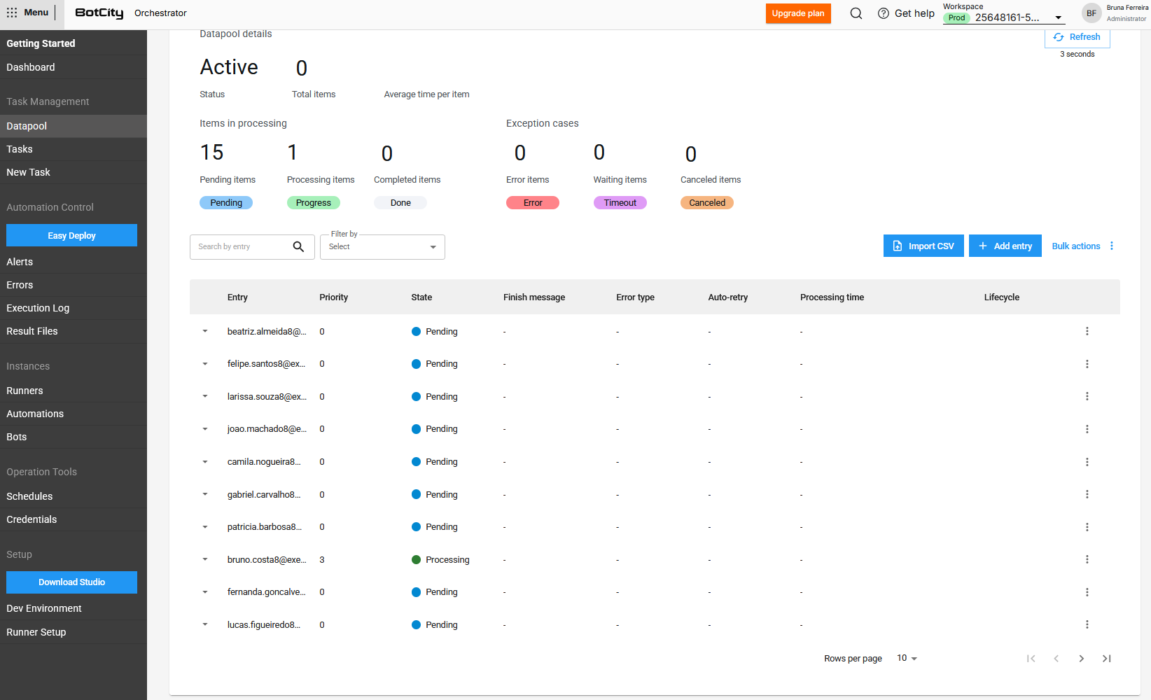 Cada item do Datapool possui diversas informações que podem ser visualizadas diretamente na plataforma do Orquestrador BotCity.