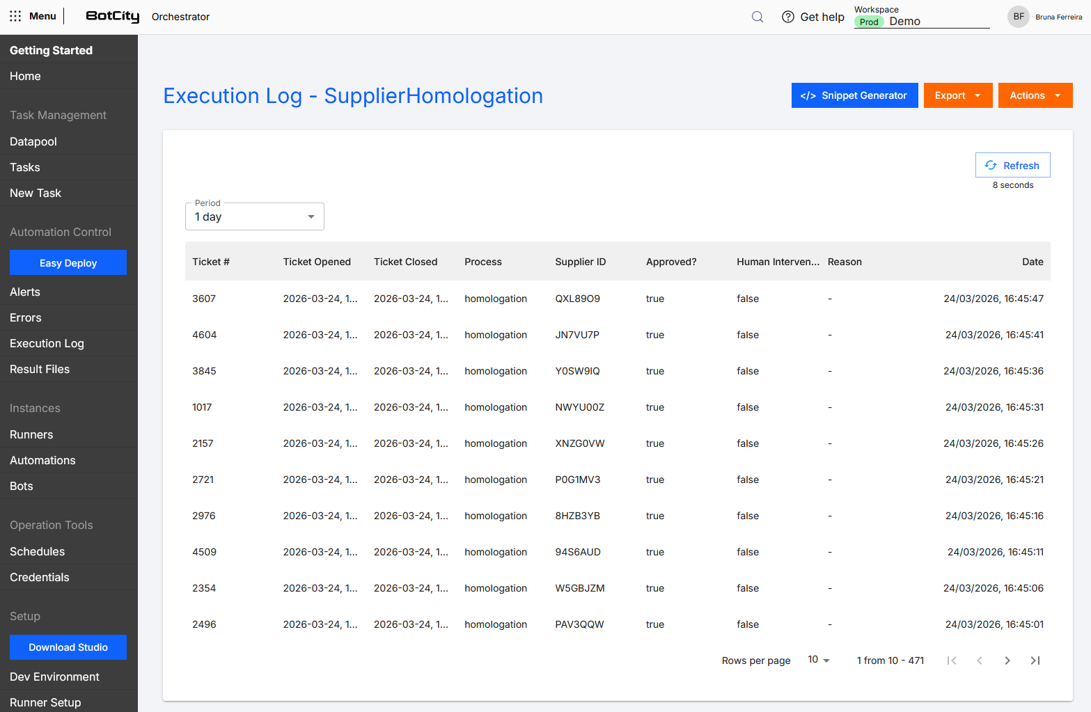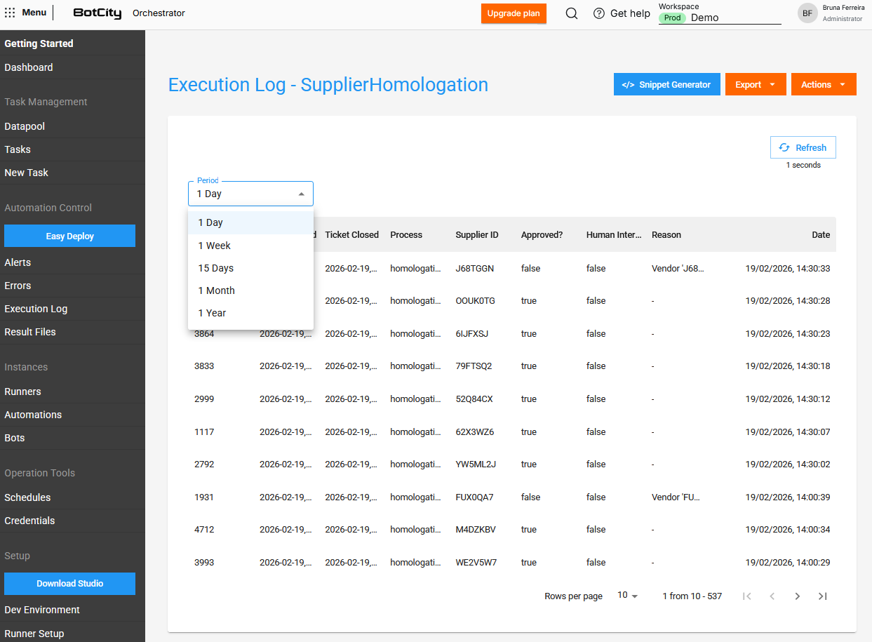 Explore o botão Gerador de Snippet ao acessar um Log de Execução para obter exemplos de código que facilitam as manipulações utilizando o SDK do BotCity Maestro. Gere trechos de código para as ações: criar uma nova entrada de log, buscar dados do log e deletar um log inteiro.