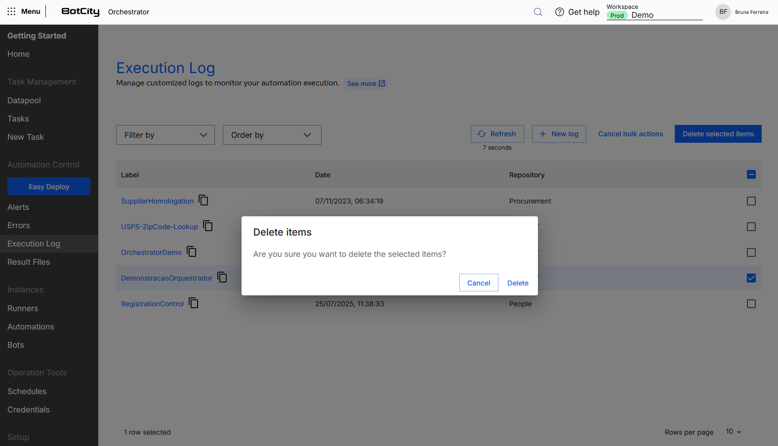 Ao criar um Log de Execução, você poderá dar entradas via código ao executar uma automação. Com os dados coletados, é possivel realizar ações como visualizar, buscar, excluir, exportar, entre outras.