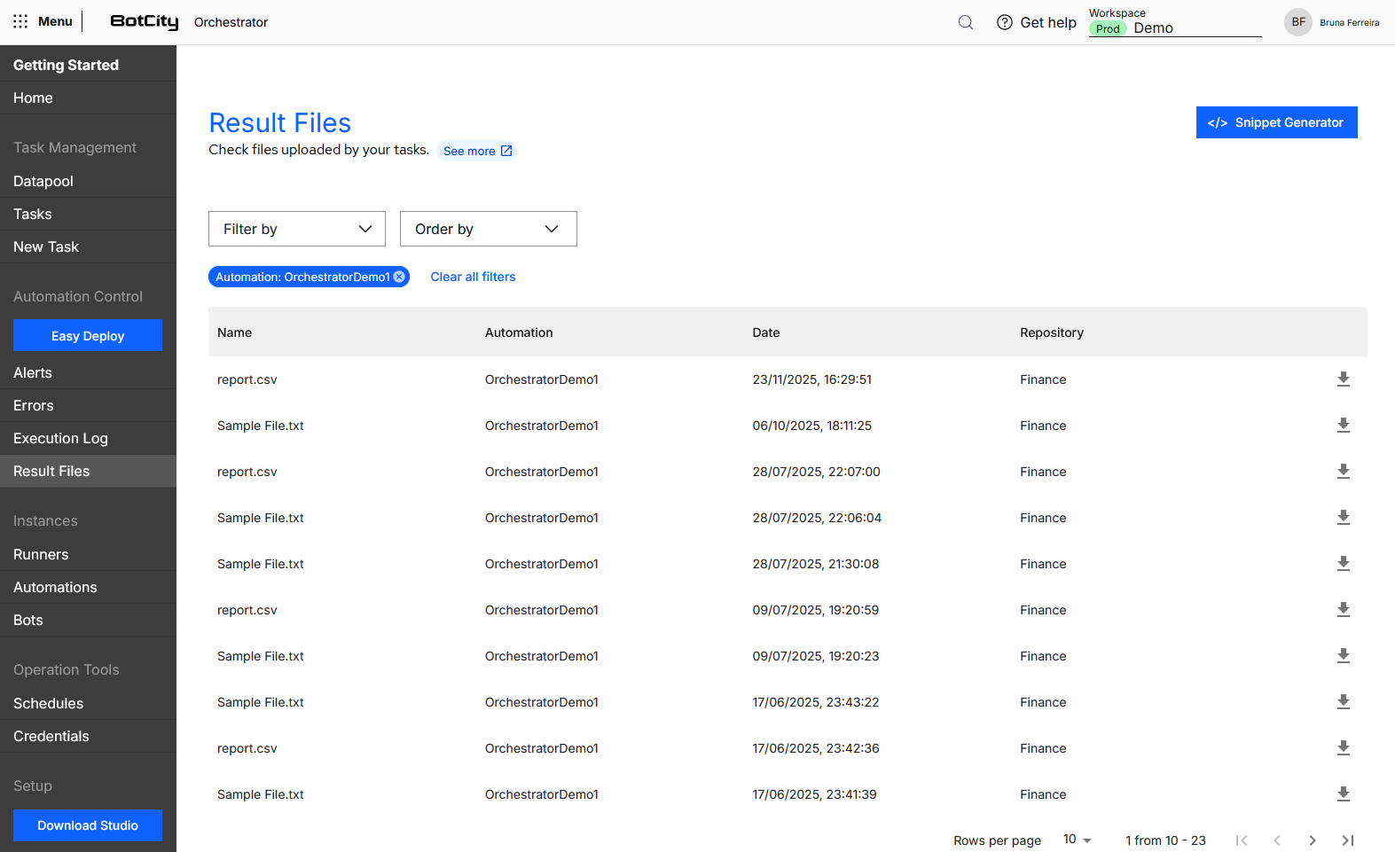 Explore o botão Gerador de Snippet para obter exemplos de código que facilitam as manipulações de arquivos de resultados utilizando o SDK do BotCity Maestro. Gere trechos de código para as ações: enviar um artefato, listar todos os artefatos e baixar um artefato.