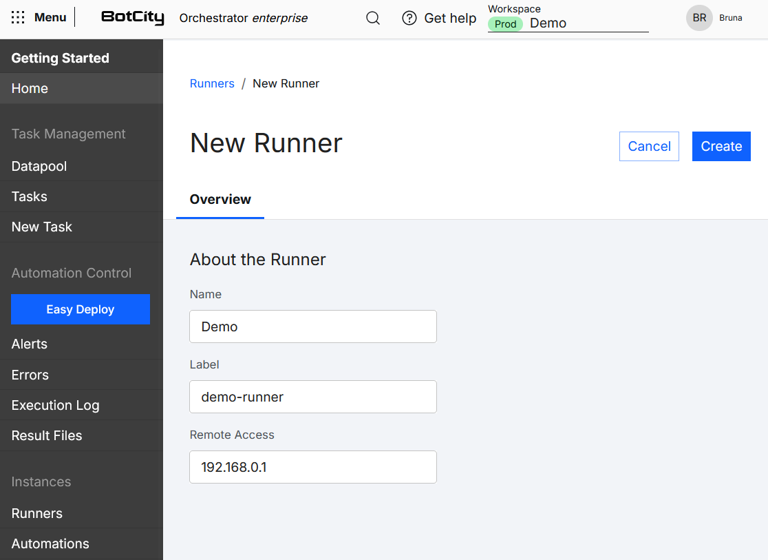 - Deletar: Remova esta instância do Runner no Orquestrador BotCity.